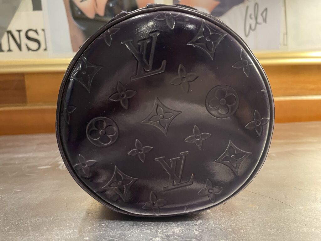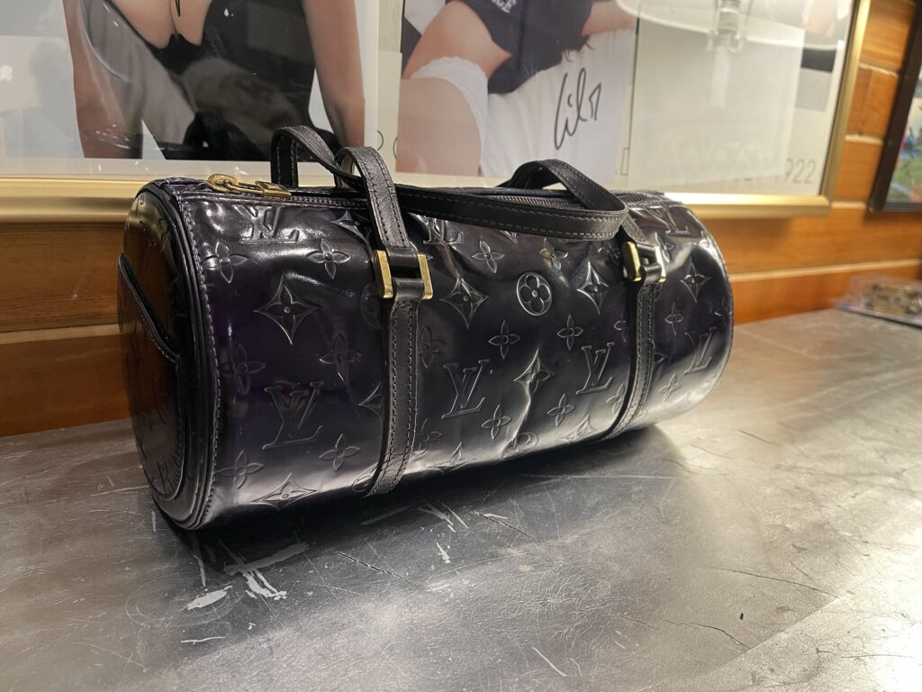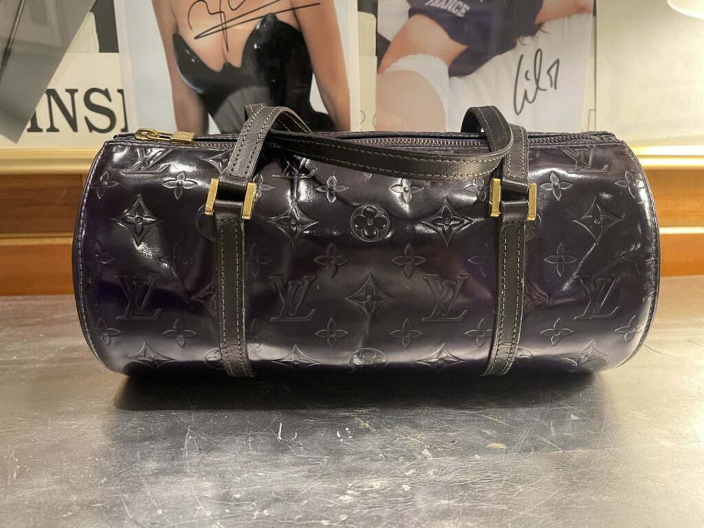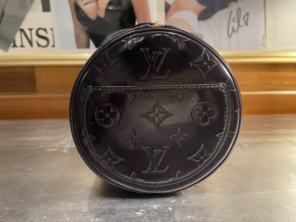 Monogram Vernis patent leather (embossed LV pattern) Distinct cylindrical “Papillon” shape Dual leather straps with gold-tone hardware High-gloss finish (prone to marks, color transfer, hazing) Structured silhouette with zip-top closure